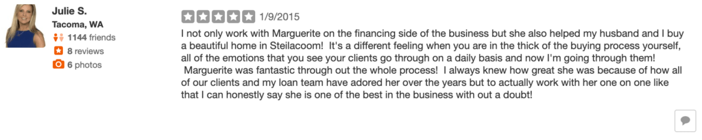 Julie Swenson, downtown Tacoma mortgage lender left this review for Marguerite after she purchased a home in Steilacoom. Julie had been working with Marguerite for years on transactions for mutual clients, and when she was ready to make a change and buy a new place she knew who to call. Thanks for the love, Julie!