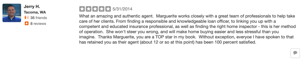 Local Insurance Agent Jerry Hallman is one of the most connected people in Tacoma. Through his work as an insurance agent he works with hundreds of mortgage brokers and real estate agents and sees how they operate behind the scenes. When the time came for him to buy a complicated investment property he reached out to Marguerite. Thanks for the review, Jerry!