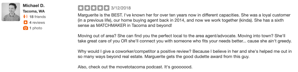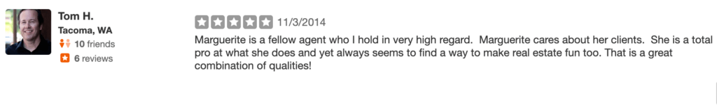 Real estate is a competitive field and real estate agents often find themselves walking a careful line with other agents- their competitors and collaborators in the industry. For this reason, we wanted to take an extra moment to highlight a sample of the reviews other real estate agents in Tacoma have left for MovetoTacoma.com creator and Tacoma agent Marguerite Martin.